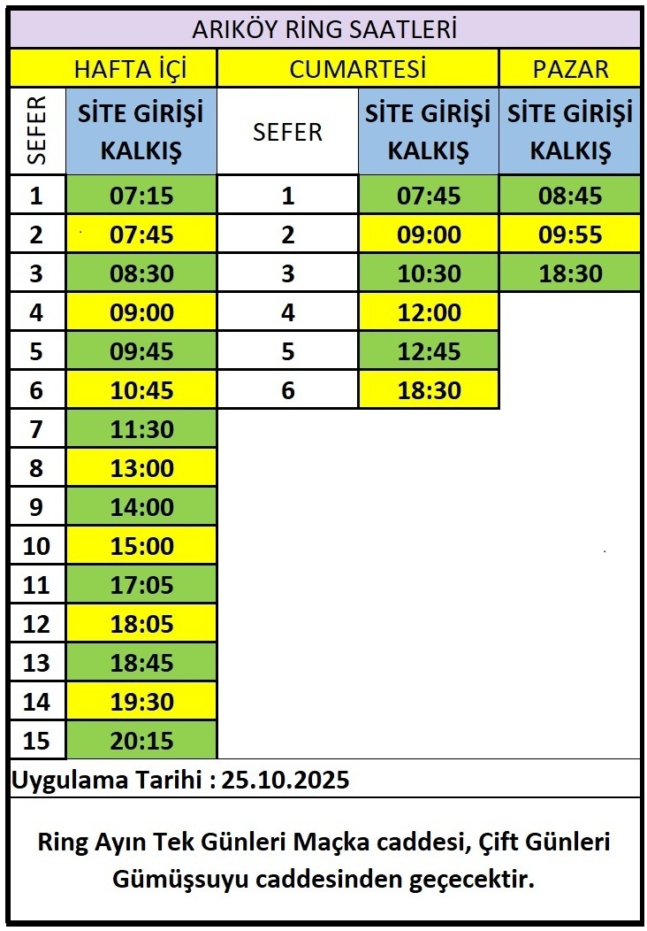 Ramazan bayrami dolayisiyla Cumartesi, Pazar, Pazartesi ve Sali gunleri Arikoy-Darussafaka Servisi hizmet vermeyecektir. Carsamba gunu tekrar hizmet vermeye baslayacaktir bilginize.